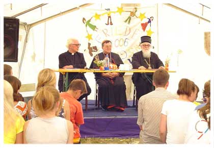 Високопреосвећени Митрополит је, захваљујући се организаторима на позиву и поздрављајући учеснике кампа поручио да је слобода, човјеку дарована од Бога, основна тајна живота, али да модерни човјек Бога, умногоме, доживљава као непријатеља слободе, цитирајући модерне мислиоце који су креирали овакву данашњу свијест. Потом је додао Јеванђеље тражи правду у међуљудским односима и у стварању људске заједнице. Тражи укидање глади и вапијуће неправде у трећем свијету, и с друге стране буржоаске саможивости. Не ради се о одмјеравању или ограничавању комфора, него о томе да човјечанство буде отворено за Божије присуство, за чудо Његовог Оваплоћења, чији циљ није просто срећан човјек, него блажен човјек, који је сазријевао на сунцу самих Христових блаженстава. Међутим, широм свијета, под крилатицом Бог је умро, отвара се пут насиљу, које жели да сроза љубав Божију на људска мјерила. Насупрот овој заблуди, придружујемо се Светим Оцима у ријечима да љубав као Света тајна братства значи: примити другога кроз Христа. У Христу и са Христом присутним у души, омогућено нам је да један у другоме препознамо брата. (Текст обраћања у цјелини) Овогодишњи камп мира, под називом Школа мира, окупио је стотињак младих римокатолика, гркокатолика и православних из Босне и Херцеговине, Њемачке, Украјине, Бјелорусије, Румуније, Литваније, Пољске, Мађарске и Хрватске, који заједничким радом, молитвом и размјеном искустава желе допринијети да помирење, мир и солидарност ојачају заједништво Европе. 13.08.2006