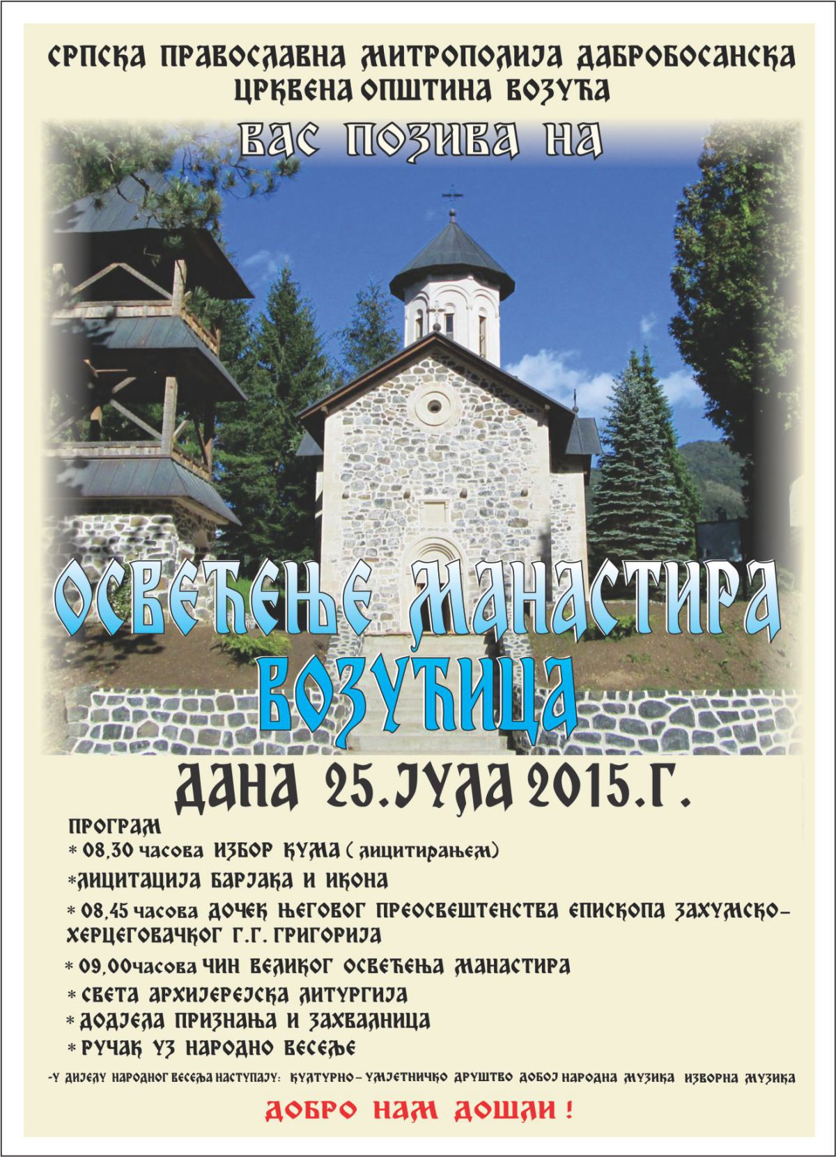Српска православна црквена општина у Нишићима позива вјернике на прославу крсне славе храма Светих Апостола Петра и Павла на Нишићима. Света литургија биће служена с почетком у 10 сати, након чега ће бити обављена литија и славски обред. Услиједиће трпеза љубави за све присутне, коју ће припремити овогодишњи кумови храмовне славе. 08. 07. 2015. У донедавно оронулој и запуштеној Спомен капели у Вардишту, на граници између БиХ и Србије, удаљеној пет километара од Мокре Горе и петнаестак од Вишеграда, у недељу по Видовдану, 5. јула, по први пут након 60 година, одржан је помен за 440 српских војника који су 1915. године, током жестоких борби у Првом свјетском рату, изгинули на овом подручју или умрли од тифуса. 01. 07. 2015. Храм Светог Саве и православно гробље у насељу Осијек код Блажуја, у федералној општини Илиџа, посјетио је, у уторак 30. јуна, потпредсједник Федерације БиХ Милан Дуновић. Старије вијести Новије вијести