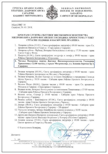 Данас је у четвртак, 4. јануара 2018. године, Његово Високопреосвештенство Господин Хризостом, Митрополит дабро-босански, упутио своју прву митрополитску поруку за Божић 2017 (2018). године. Бројни новинари и ТВ сниматељи окупили су се у зграду митрополије у Сарајаву и тачно 12:00 часова Високопреосвећени је упутио своју поруку преко елекронских медија.