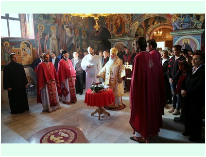 Свету службу Божију служио је Његово високопреосвештенство Архиепископ цетињски Митрополит црногорско-приморски г. Амфилохије са Високопреосвећеним Архиепископом сарајевским и Митрополитом дабробосанским Хризостом и Преосвећеном господом епископима: милешевским Атанасијем, полошко-кумановским Јоакимом, рашко-призренским и косовско-метохијским Теодосијем, бихаћко-петровачким Сергијом, буеносајрески и јужно-централноамеричким Кирилом, захумско-херцеговачким Димитријем и умировљеним захумско-херцеговачким Атанасијем.