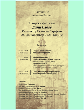 У саборној цркви Рођења Пресвете Богородице у Сарајеву, 26. новембра 2021. године отворен је трећи фестивал хорског пјевања у организацији Српског пјевачког друштва ''Слога'' на челу са предсједником јерејем Ђуреиновић Немањом. Овај фестивал свечано је отворио и благословио Његово Високопреосвештенство митрополит дабробосански Господин Хризостом.