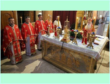 На светој литургији Његовом Високопреосвештенству саслуживали су: свештеноигуман Георгије Станковић, намјесник манастира Озерковићи, јеромонах Владимир Ђуричић, намјесник манастира Кнежина, јереји Немања Лакић и Томислав Пајевић, те ђакон Будимир Гардовић. На крају Свете литургије Високопреосвећени митрополит Хризостом преломио је колач и осветио кољиво у славу и част Светог Јована Златоустог.