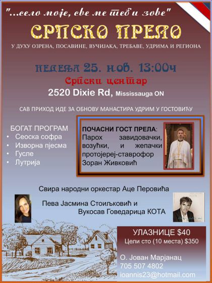 Идеја за одржавање овог дружења је потекла од свештеника Јована Марјанца, секретара канадске епархије, који је уједно преузео на себе одговорност и бригу за комплетну организацију овог дружења и донаторског ручка. У жељи да окупи што већи број људи, ово дружење је најавио као ''СРПСКО ПРЕЛО '' у духу Озрена, Посавине, Вучијака, Требаве, Удрима и региона. Овом свечаном сабрању и дружењу, по благослову Његовог Високопреосвештенства Митрополита дабро – босанског Г. Г. Хризостома, присуствовао је и администратор манастира Удрим протојереј – ставрофор Зоран Живковић.